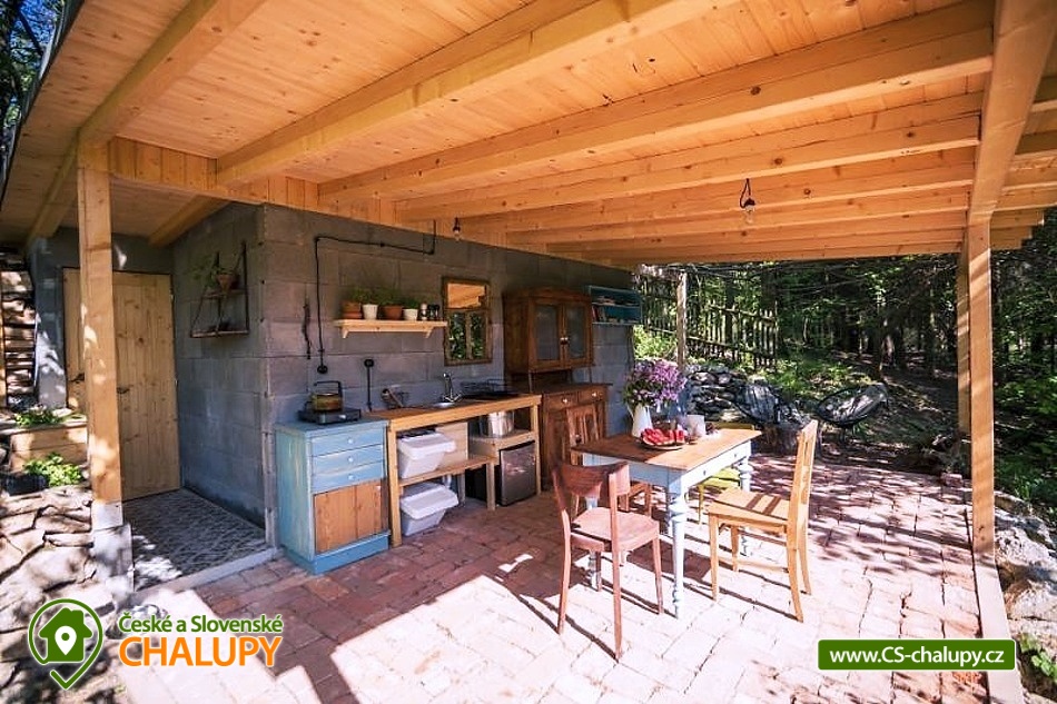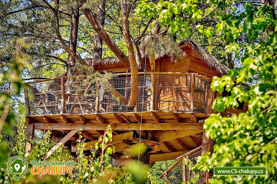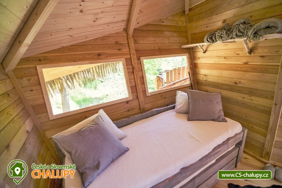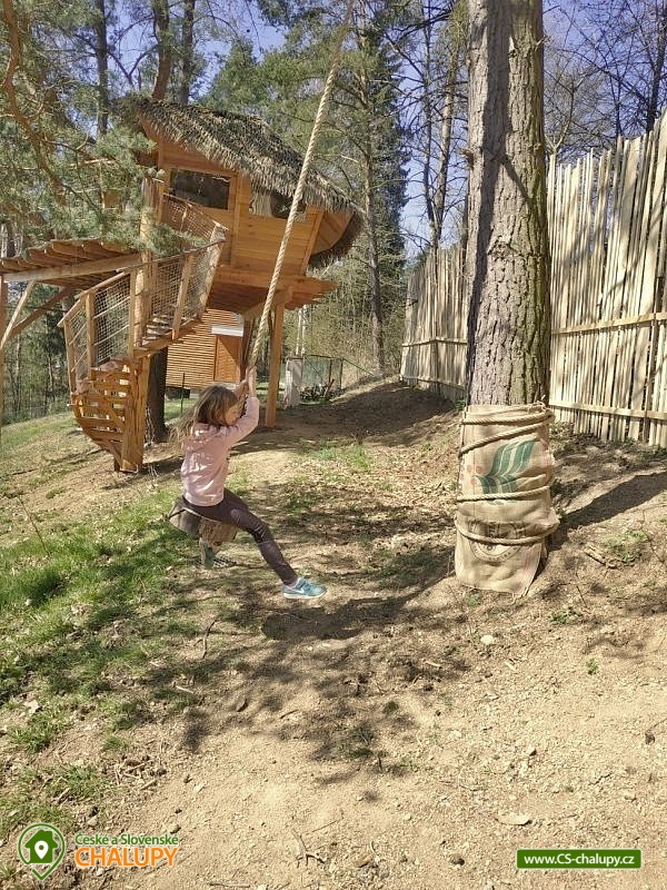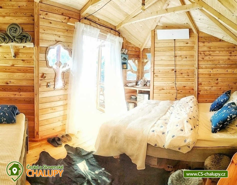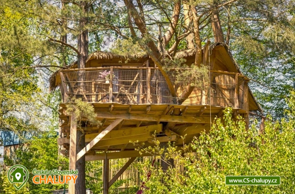 Wellness glamping - Treehouse u Sázavy - obec Leštinka na Vysočině. Unikátní chata na stromě v korunách tří borovic ve výšce cca 3 metrů nad zemí. K dispozici je také wellness, kde si zde můžete užít horkou koupel v cedrovém koupacím sudu HOT TUB a zkusit své kuchařské umění ve stylové zahradní kuchyni. Glamping se nachází na okraji chatové osady přímo u lesa v krásné lokalitě přírodní rezervace Stvořidla. Jedná se o část řeky Sázavy, která je úzce spojena se spisovatelem Jaroslavem Foglarem. Především jeho sluneční zátoka utkvěla jistě v mysli nejednomu čtenáři. V bezprostřední blízkosti vede cyklistická a turistická stezka. A o několik kilometrů dále lze navštívit města Lipnice nad Sázavou (Haškova Lipnice) Ledeč nad Sázavou a Světlá nad Sázavou. Prostorný treehouse poskytuje ubytování se snídaní pro až 4 osoby. Ubytování je pet friendly - domácí mazlíčky si tak můžete vzít s sebou. Útulný interiér domu na stromě je vybaven masivním a kvalitně zpracovaným nábytkem. Manželskou postel doplňuje rozkládací postel (pohovka), takže se zde pohodlně ubytuje i čtyřčlenná rodina nebo parta kamarádů. Dále je uvnitř kuchyňka, kde si lze uvařit čaj nebo dobrou kávu. Její součástí je i vinotéka s vybranými druhy vín. Nepostradatelná je především terasa, na které se ráno při snídani nebo večer u sklenky dobrého vína můžete kochat krásným výhledem na lesy a údolí řeky Sázavy. Těšit se můžete na bohatou snídani, která vám bude v dohodnutý čas připravena do piknikového koše, který si na terasu sami vytáhnete. Také si můžete něco dobrého připravit v plně vybavené stylové zahradní kuchyni na vařiči, grilu nebo něco dobrého ugrilovat na zahradním ohništi. Veškeré potřebné vybavení je k dispozici: varná konvice, indukční plotýnka, Gril Weber, svítilny, nádobí, ručníky, osušky a nádobí. Malý návštěvníci se mohou těšit na prolézačky. Sociální zařízení zahrnuje jednu samostatnou koupelnu se sprchovým koutem, umyvadlem a toaletou. Vytápění je řešeno přímotopem. Koupelna je vyhřívaná celoročně. V zimních měsících může být v domě chladněji, je vhodné mít sebou teplejší oblečení. Parkovat lze u řeky cca 200 m vzdálené od Treehouse, ke kterému poté vede romantická cestička lesíkem (nevhodná pro kočárky). U domu si děti i dospělí mohou hrát v přilehlém lese, nebo objevovat přírodu ve smyslové zahradě. V okolí Treehouse rostou ovocné keře, stromy, jahody, maliny a další dobroty, které jsou vhodné pro mlsání. Koupání v teplých letních měsících zajišťuje pro otužilce řeka Sázava. Pro ty, co mají radši teplou vodu je k dispozici cedrový koupací sud HOT TUB, který je potřeba si vytopit, naštípat dřevo na podpal a přikládat do kamen. Treehouse je báječná základna pro turistiku, výlety na kole a koloběžce, houbaření, rybaření, tedy pro odpočinek všeho druhu. Mezi možnosti koupání patří např.: lom Lipnice nad Sázavou, Kouty - rybník Homole, lom Trojka Lipnice, rybník Ředkovec, rybník Kachlička, lom Peklo, koupaliště Olešná (u Havličkova Brodu), koupaliště Humpolec - Žabák , Haberský rybník, Plačkovský rybník, přehrada Vřesník, koupaliště Havličkův Brod, atd. V zimním období blízká lyžařská střediska: Kadlečák a Melechov. K výletům láká Haškova Lipnice, Zámek ve Světlé nad Sázavou, Hrad v Ledči nad Sázavou, Rozhledna Melechov, Tvrz Proseč u Humpolce nebo Zámek Vilémovice. V domě na stromě si zaručeně užijete dobrodružství a splníte si své dětské sny. Těšíme se na Vás u nás!