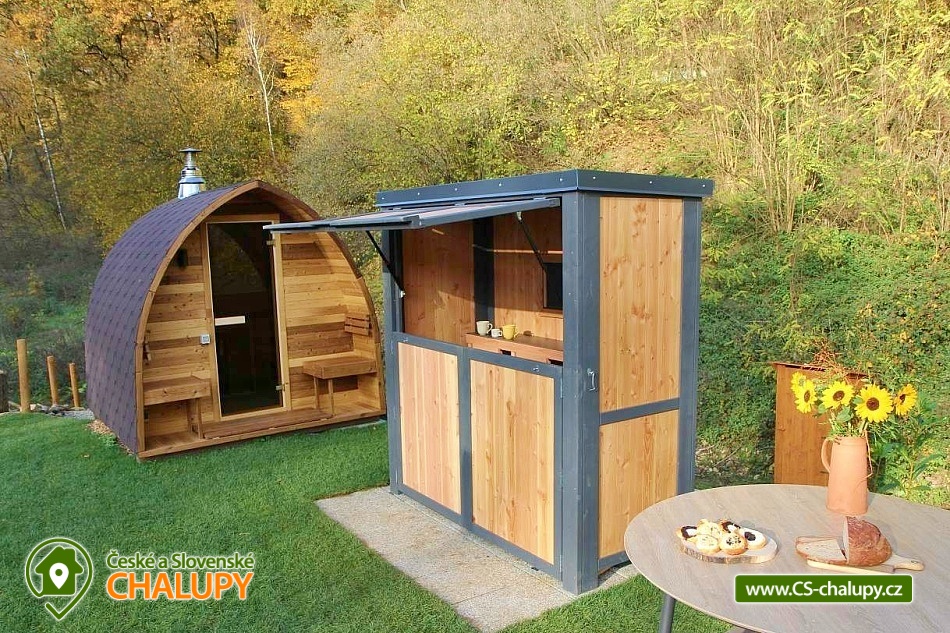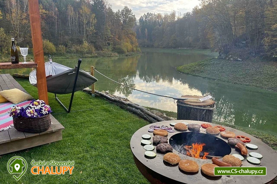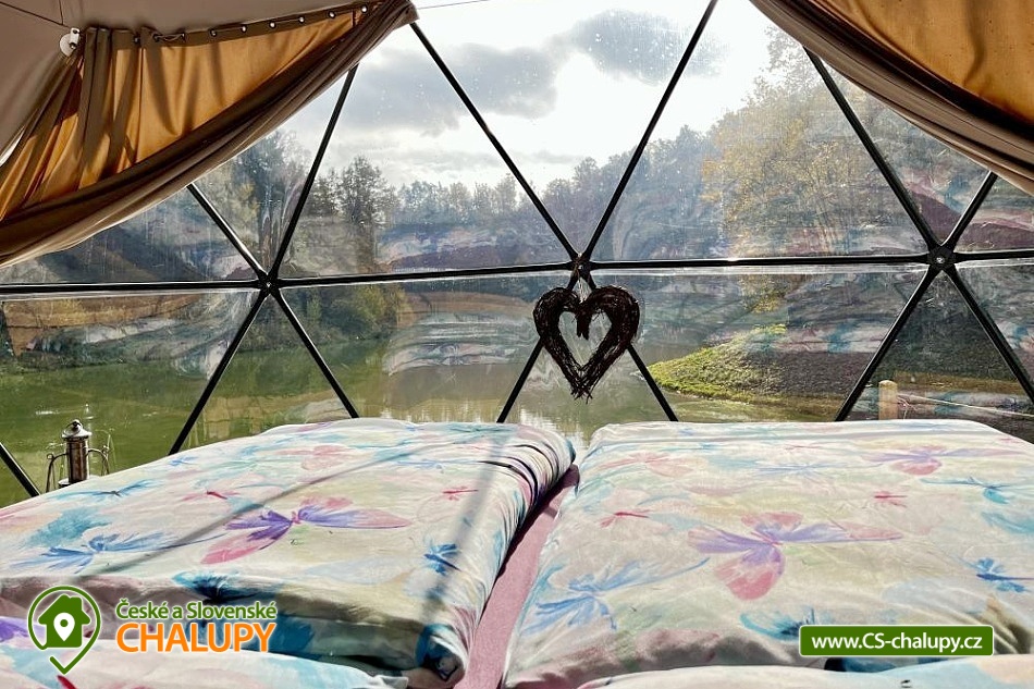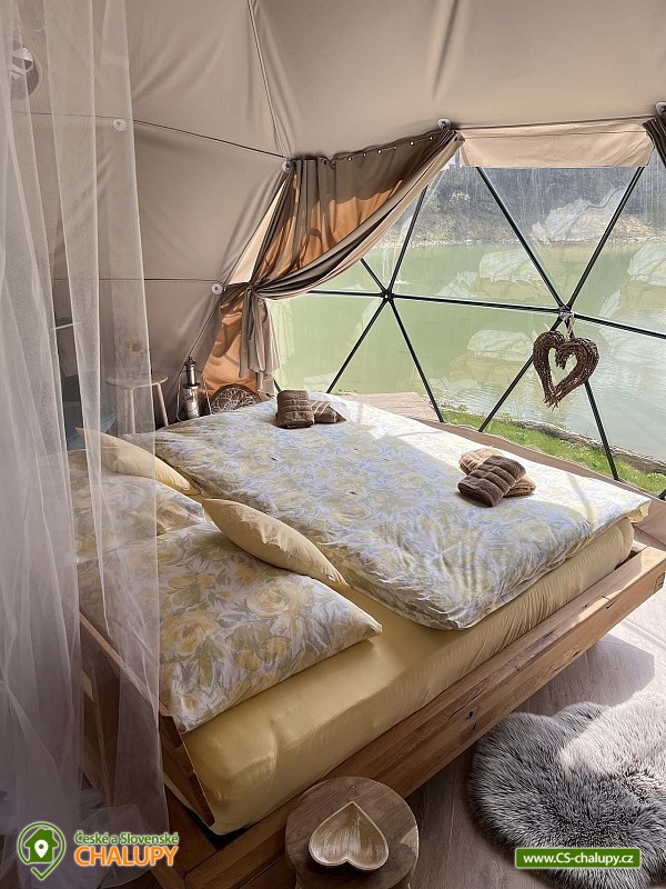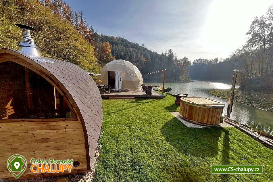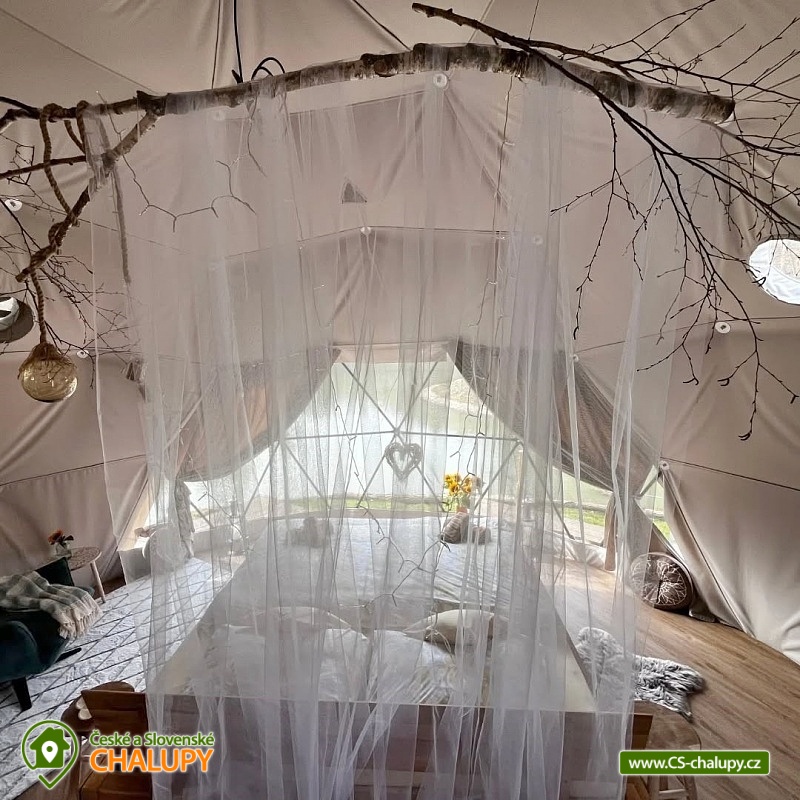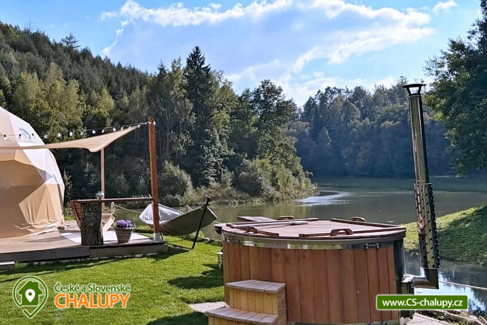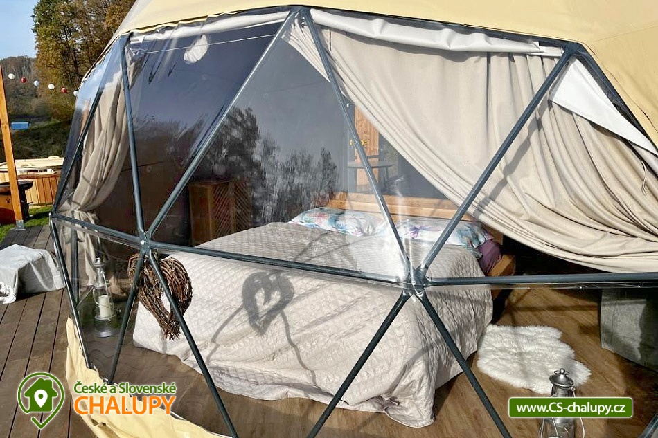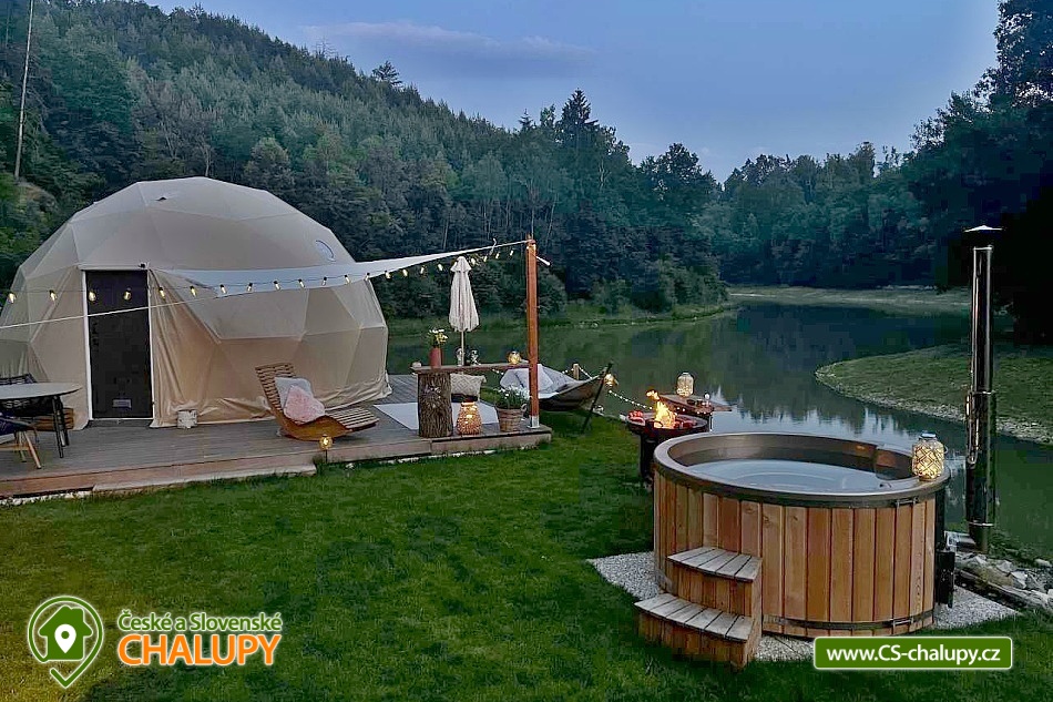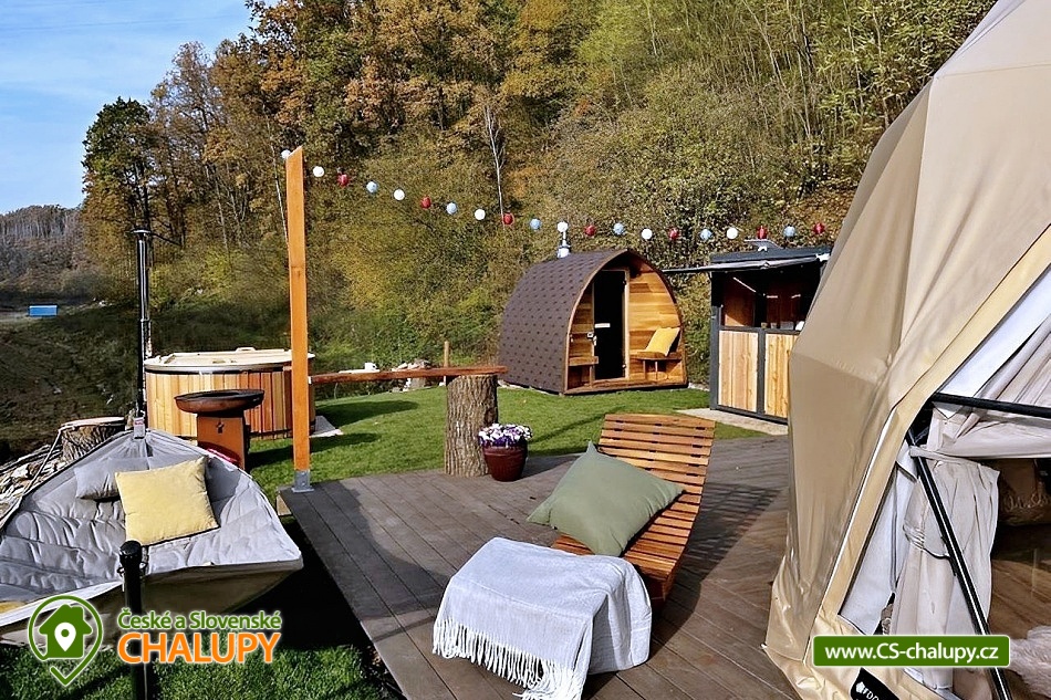 A luxurious glamping tent for 2 people with a sauna and a hot tub on a private peninsula by a pond in the beautiful natural landscape of the Kokořínsko and Mácha Region Protected Area. And the best part? You can't see any buildings! You can stay from April to mid-November. The spacious glamping tent (20m²) with stylish natural decoration has a large soft bed 200x200 cm with bedding. Directly from the bed you can enjoy the beautiful views of the picturesque valley through the panoramic windows. The tent includes storage space and a chair with a table. The ideal temperature in any weather is ensured by an air conditioning unit in the tent. WIFI internet connection is available. Directly from the tent you can enter the terrace made of exotic wood, which is a paradise for barefoot feet. On the terrace, there is a two-seater swing and a wooden swinging deck chair for pleasant lounging. A soft and carefully cut lawn stretches around the terrace for your maximum comfort. The outdoor area includes a fully equipped kitchenette (fridge, coffee maker, hob, kitchen utensils, dishes and a barrel with drinking water). The main feature for preparing delicious meals is the Taranis barbecue fire, where you can prepare everything from crispy steaks to finely grilled vegetables. A sauna with a panoramic window overlooking nature and a hot tub offer amazing relaxation. There is also a bathroom with an open-air shower and an outdoor chemical toilet outside. A washbasin, towels, toiletries, soap and toilet paper are available. The bathroom is designed so that you feel in touch with nature, but at the same time enjoy maximum comfort. Parking is available directly at the property. In the vicinity of the glamping, there is the possibility of hiking, cycling, swimming, fishing and mushroom picking. There are tennis courts, a football pitch and a fitness centre nearby. You can fish directly in the private pond of the owners of the property. This pond is richly stocked with carp, grass carp, sturgeon and large catfish, so both beginners and experienced fishermen will find something to their liking. Swimming options include: Mšeno Swimming Pool, Bělá pod Bezdězem Swimming Pool, Harasov Natural Swimming Pool, Mladá Boleslav City Swimming Pool and Swimming Pool, Máchovo Lake, Staré Splavy Aquapark, etc. Excursions in the surrounding area are attractive to the majestic Bezděz Castle, the mysterious Houska Castle or the romantic Kokořín, as well as the Lobeč Brewery, the former Ralsko military area, the Bělá pod Bezdězem sports and recreation area with a 7-kilometer in-line and cycling track, a ropes course or a mini zoo, Máchovo Lake, the Zvířetice ruins, Stránov Chateau, Vrátenská Lookout Tower, Pokličky, the Bludiště Rock City, Mšeno City Spa or the historical center of Mělník with the confluence of the Elbe and Vltava rivers. We look forward to seeing you there.