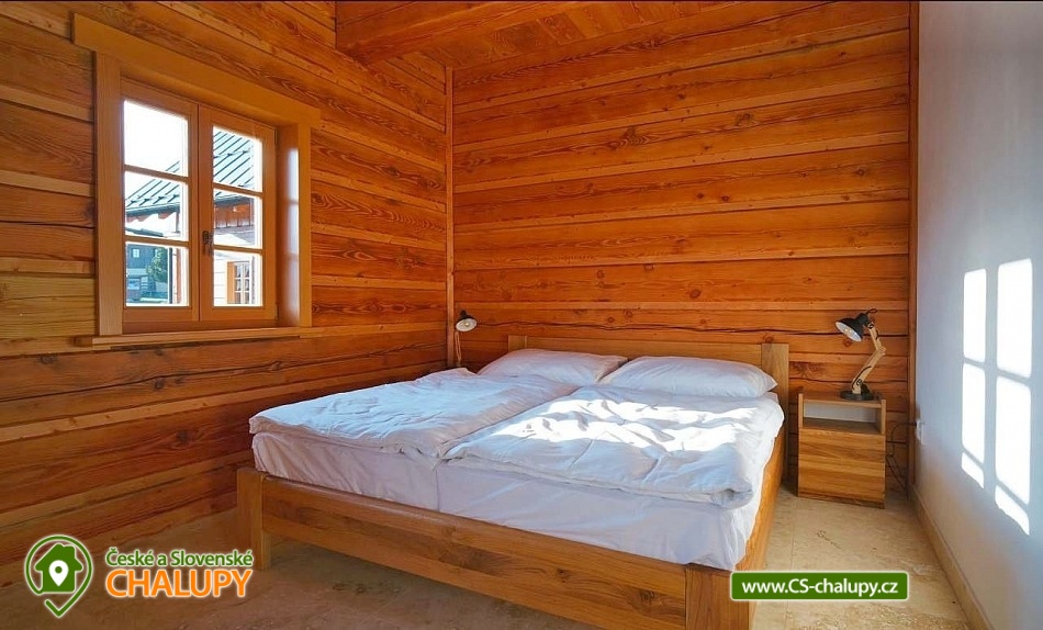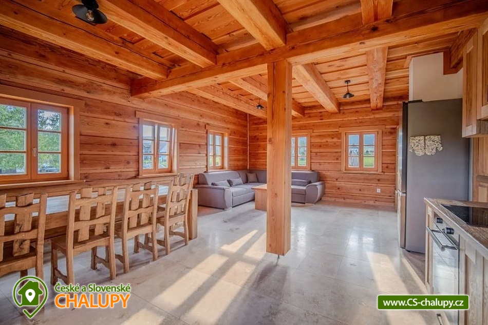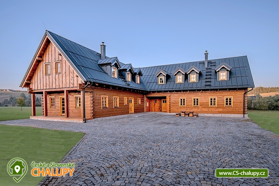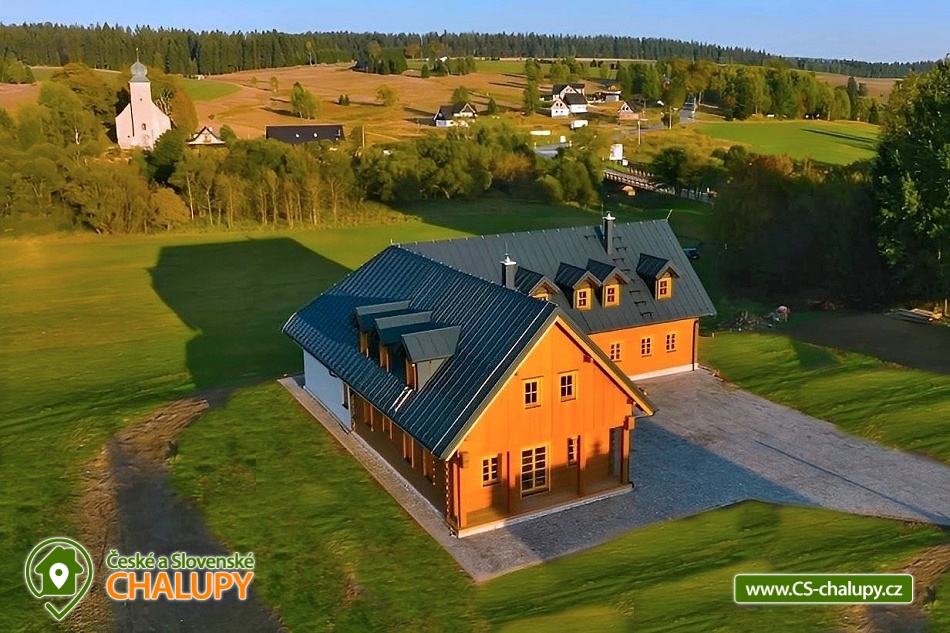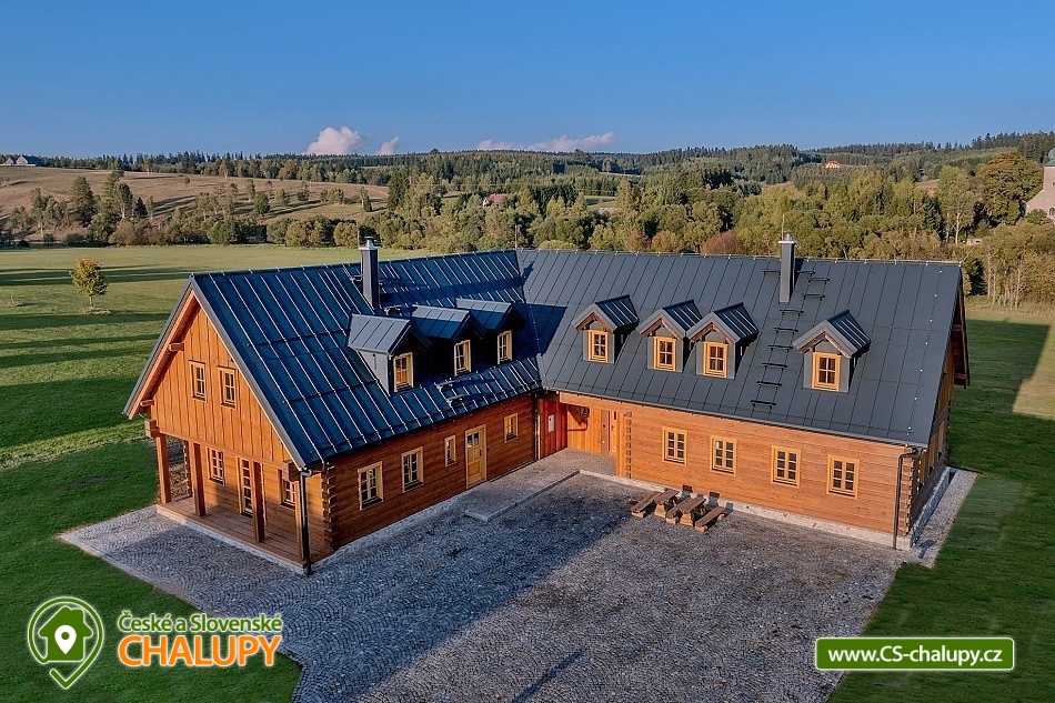 Wellness log cabin with an indoor pool in the beautiful surroundings of the Orlické Mountains. Wellness - infrared sauna, outdoor jacuzzi and indoor pool. The capacity of the cottage is up to 27 people in 9 bedrooms. The log cabin will intoxicate you with the delicious aroma of Douglas fir wood from which it is made. There are 2 separate apartments available - Tichá Orlice (9 beds + 3 extra beds) and Divoká Orlice (11 beds + 4 extra beds) with a private entrance. You can rent the log cabin as a whole or each apartment separately. The stay is ideal for a family vacation, meeting with friends or corporate teambuilding. DESCRIPTION: The Tichá Orlice apartment has 9 fixed beds and 3 extra beds in 5 bedrooms. There is 1 double bedroom (double bed) on the ground floor and 1 single bedroom and 3 double bedrooms (2x two single beds and 1x double bed) on the first floor. The Divoká Orlice apartment has 11 fixed beds and 4 extra beds in 5 bedrooms. There is 1 double bedroom (double bed) on the ground floor and 3 double bedrooms (2x two single beds and 1x double bed) on the first floor and 1 spacious triple bedroom (double bed and single bed) with a sofa bed (1x extra bed), TV, mini fridge and coffee maker. In both apartments there are 3 extra beds (sofa bed in the living room + possibility of another single bed). A cot and high chair are available for rent. In both apartments, there is a living room with a fireplace, a sofa, a dining table and a fully equipped kitchen (coffee maker, kettle, oven, induction hob, microwave, fridge, freezer, toaster and dishwasher) for social moments. There is a TV with SAT and WIFI internet connection. The sanitary facilities include a total of 4 bathrooms with a shower and 4 toilets. Both apartments have one bathroom and toilet on the ground floor and on the first floor. Both apartments have a washing machine, dryer, cloakroom and ski storage room with a boot dryer. Heating and hot water are provided by a heat pump, including heating the water in the pool. There are fireplaces and there is underfloor heating throughout the ground floor and in the wellness area. Both apartments have direct access to the shared wellness area, which all guests can use without restrictions. A grassy garden extends around the log cabin. You can sit on the outdoor terrace. An outdoor hot tub will provide relaxation. In the future, you can also look forward to an outdoor Finnish sauna, a bike shed, an outdoor kitchen, a children's playground and more. You can park directly at the property. Up to 10 parking spaces are available. In the vicinity of the log cabin, there is the possibility of hiking, cycling, swimming, mushroom picking, in-line skating, skiing, snowboarding and cross-country skiing. There is a riding stable nearby. Swimming options include: Deštné Swimming Pool in the Orlické Mountains, Rokytnice Swimming Pool in the Orlické Mountains, Dobré Swimming Pool, Kunvald Swimming Pool, Rychnov nad Kněžnou Swimming Pool, etc. In winter, nearby ski resorts are available: SKi area Orlické Záhoří with a modernly equipped downhill run - the longest in the Orlické Mountains, Ski Center Říčky, SKI CLUB Kostelec - Zdobnice, Ski Deštné in the Orlické Mountains and others. The Spiders Centre Rope Park, military fortifications such as the Průsek Infantry Blockhouse or Hanička Fortress, the Anna Lookout Tower on Anenský vrch, the Villa Nova Uhřínov Open-Air Museum, the Tyrš Lookout Tower or the Rychnov nad Kněžnou Chateau are all great places to visit in the area. We look forward to seeing you there.