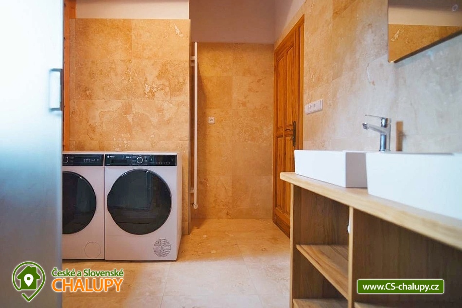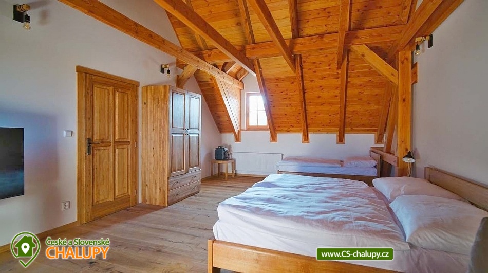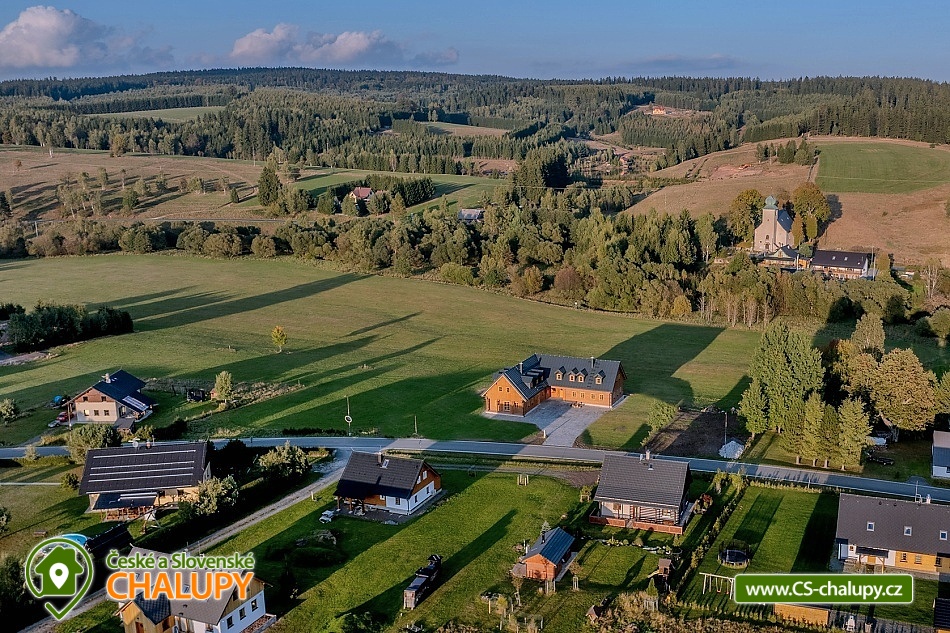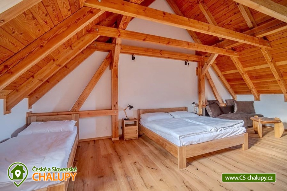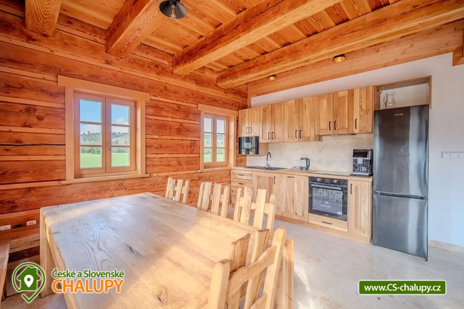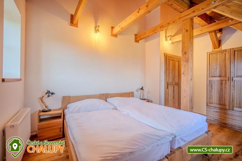 Wellness log cabin with an indoor pool in the beautiful surroundings of the Orlické Mountains. Wellness - infrared sauna, outdoor jacuzzi and indoor pool. The capacity of the cottage is up to 27 people in 9 bedrooms. The log cabin will intoxicate you with the delicious aroma of Douglas fir wood from which it is made. There are 2 separate apartments available - Tichá Orlice (9 beds + 3 extra beds) and Divoká Orlice (11 beds + 4 extra beds) with a private entrance. You can rent the log cabin as a whole or each apartment separately. The stay is ideal for a family vacation, meeting with friends or corporate teambuilding. DESCRIPTION: The Tichá Orlice apartment has 9 fixed beds and 3 extra beds in 5 bedrooms. There is 1 double bedroom (double bed) on the ground floor and 1 single bedroom and 3 double bedrooms (2x two single beds and 1x double bed) on the first floor. The Divoká Orlice apartment has 11 fixed beds and 4 extra beds in 5 bedrooms. There is 1 double bedroom (double bed) on the ground floor and 3 double bedrooms (2x two single beds and 1x double bed) on the first floor and 1 spacious triple bedroom (double bed and single bed) with a sofa bed (1x extra bed), TV, mini fridge and coffee maker. In both apartments there are 3 extra beds (sofa bed in the living room + possibility of another single bed). A cot and high chair are available for rent. In both apartments, there is a living room with a fireplace, a sofa, a dining table and a fully equipped kitchen (coffee maker, kettle, oven, induction hob, microwave, fridge, freezer, toaster and dishwasher) for social moments. There is a TV with SAT and WIFI internet connection. The sanitary facilities include a total of 4 bathrooms with a shower and 4 toilets. Both apartments have one bathroom and toilet on the ground floor and on the first floor. Both apartments have a washing machine, dryer, cloakroom and ski storage room with a boot dryer. Heating and hot water are provided by a heat pump, including heating the water in the pool. There are fireplaces and there is underfloor heating throughout the ground floor and in the wellness area. Both apartments have direct access to the shared wellness area, which all guests can use without restrictions. A grassy garden extends around the log cabin. You can sit on the outdoor terrace. An outdoor hot tub will provide relaxation. In the future, you can also look forward to an outdoor Finnish sauna, a bike shed, an outdoor kitchen, a children's playground and more. You can park directly at the property. Up to 10 parking spaces are available. In the vicinity of the log cabin, there is the possibility of hiking, cycling, swimming, mushroom picking, in-line skating, skiing, snowboarding and cross-country skiing. There is a riding stable nearby. Swimming options include: Deštné Swimming Pool in the Orlické Mountains, Rokytnice Swimming Pool in the Orlické Mountains, Dobré Swimming Pool, Kunvald Swimming Pool, Rychnov nad Kněžnou Swimming Pool, etc. In winter, nearby ski resorts are available: SKi area Orlické Záhoří with a modernly equipped downhill run - the longest in the Orlické Mountains, Ski Center Říčky, SKI CLUB Kostelec - Zdobnice, Ski Deštné in the Orlické Mountains and others. The Spiders Centre Rope Park, military fortifications such as the Průsek Infantry Blockhouse or Hanička Fortress, the Anna Lookout Tower on Anenský vrch, the Villa Nova Uhřínov Open-Air Museum, the Tyrš Lookout Tower or the Rychnov nad Kněžnou Chateau are all great places to visit in the area. We look forward to seeing you there.