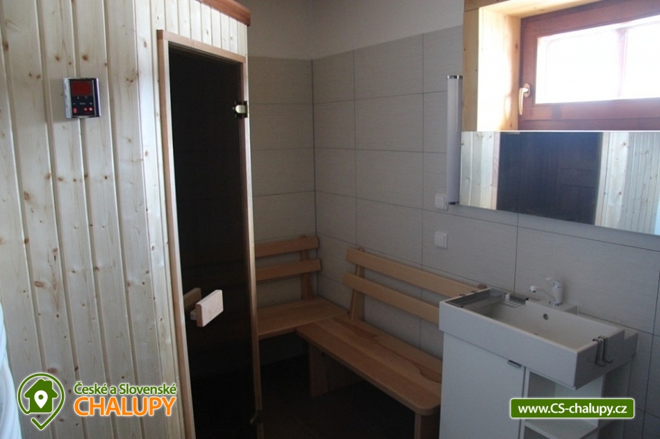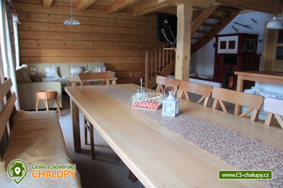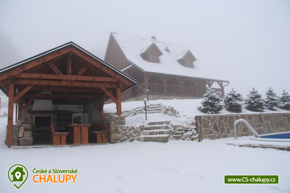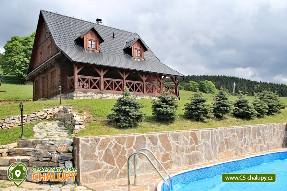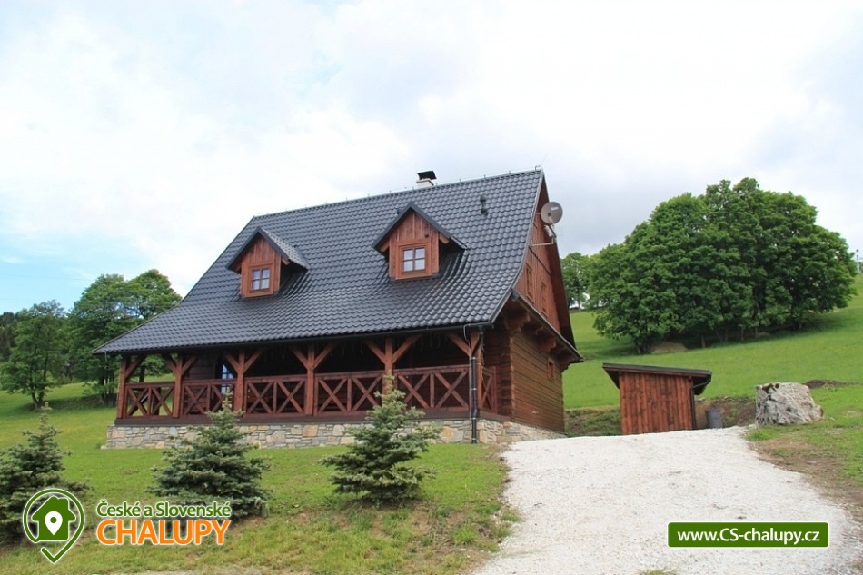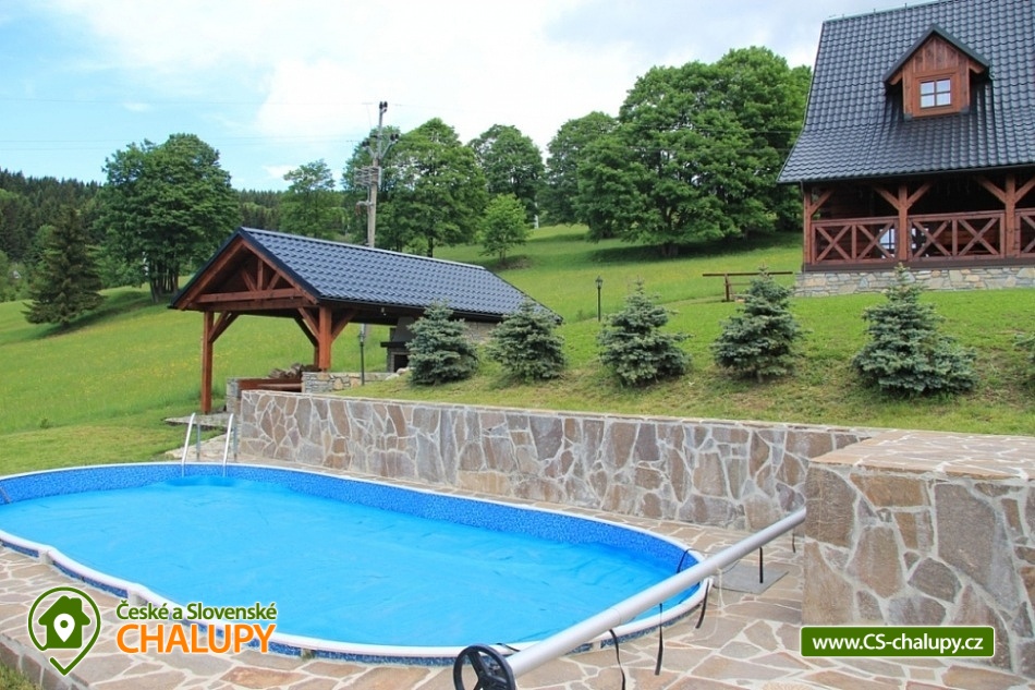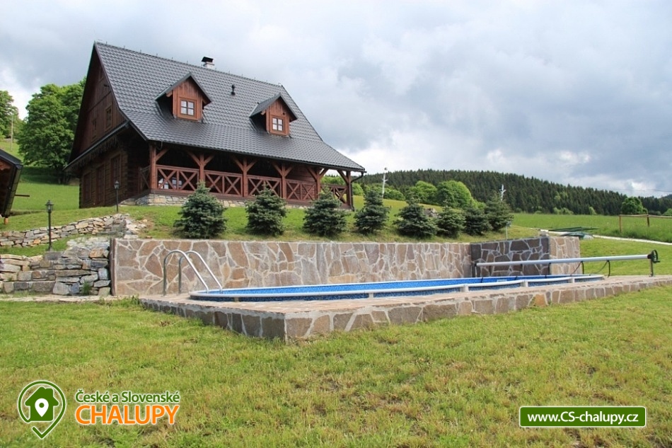 Roubenka Rozárka II - wellness with Finnish sauna and pool - Velké Vrbno. Cottage Rozárka II is located on the border of Hrubý Jeseník, Kralický Sněžník and Rychlebské mountains in the village of Velké Vrbno at an altitude of 820 m and is surrounded by beautiful nature with exceptionally clean mountain air. Inside the cottage can accommodate up to 15 people in five separate rooms on the first floor (2x4 and 1x3 beds) and attic (2x2 beds). On the ground floor there is a large living room with kitchen, a beautiful tiled stove with a bread oven and a seating area and a dining area. The kitchen is modernly equipped with an induction hob, dishwasher, microwave with grill, kettle and coffee maker with Dolce Gusto capsules. The living room has a comfortable corner sofa and a large TV with satellite reception. There is also a blue ray player for long winter evenings. The large bathroom has a Finnish sauna and a shower with a massage panel. The ski room has a wall-mounted radiator boot dryer and two stands for skis and snowboards. All rooms are equipped with TV and WiFi. For maximum comfort, there are three bathrooms. The building is heated by electric underfloor heating and tiled stove. The chalet has its own well. Water from a depth of 56m has the parameters of baby water. In summer, a 7 m long pool heated by a heat pump is available for both log cabins. In addition to the log cabin, there is also a covered seating area with a fireplace and a smokehouse and a children's playground. The outdoor covered seating area with a fireplace and smokehouse works great. In 1 to 2 hours, sausages and sausages are perfectly used. The smoking of partially pre-fried meats is done in 8 to 10 hours. The cottage is located between the slopes of the Paprsek-Olšanka Ski Resort. On the left side it is 80 m away from the two-seater cable car to Paprsek, on the right side there is a ski lift Olšanka 800 m long at a distance of 60 m. At the boarding station to the chair lift there is a large mountain hut Vindoška. Here it is possible to eat during the operation of the lift. Mountain cottage Paprsek at an altitude of 1022 m is open all year round. The area has four slopes with lengths of 800-1300 m and the largest SNOW PARK in the Czech Republic. There is a ski school and a school, as well as ski and snowboard rental. The area is groomed several times a week by over 70 km of cross-country ski trails, including ski trails in Poland. In summer, it is possible to use the many cycling routes in the area or enjoy the peace and quiet of this location and take trips to the near or distant surroundings.