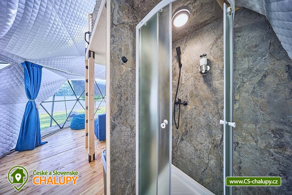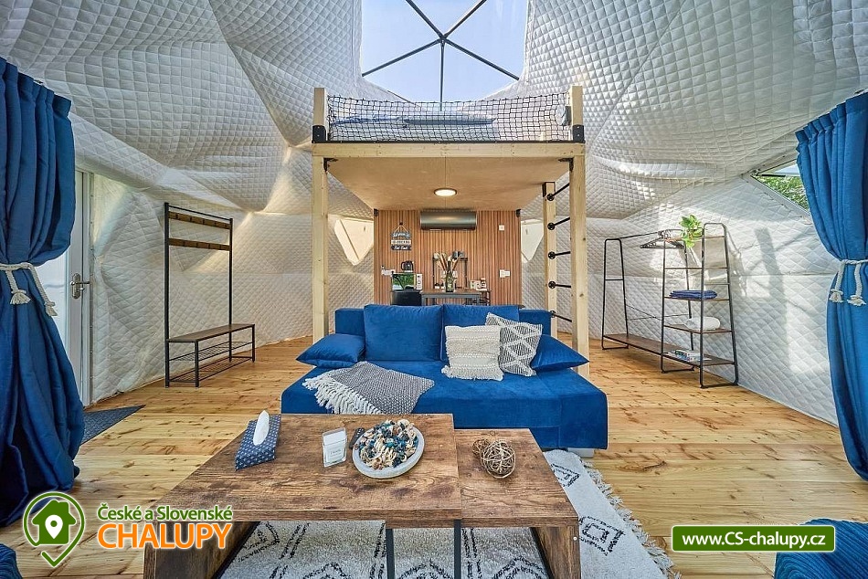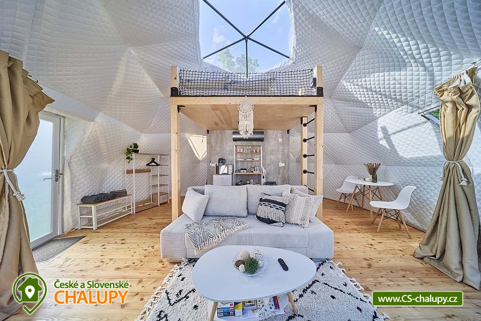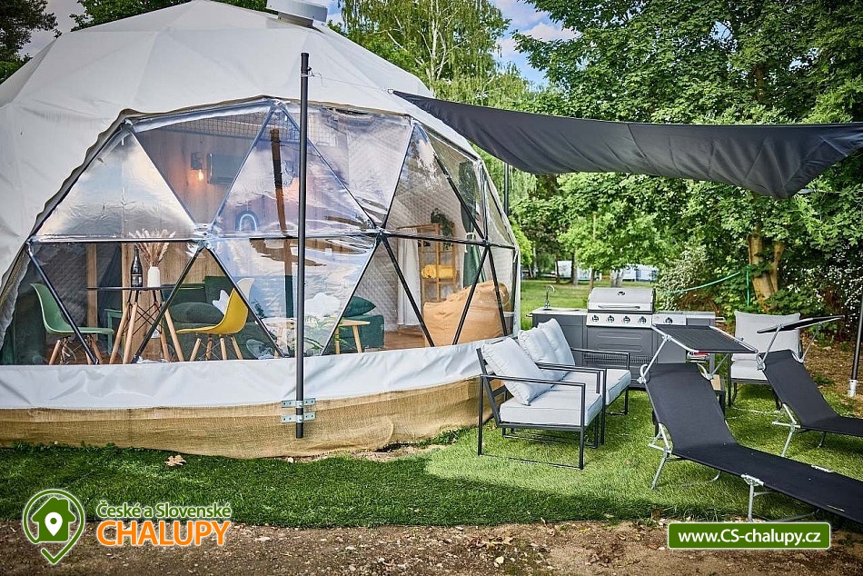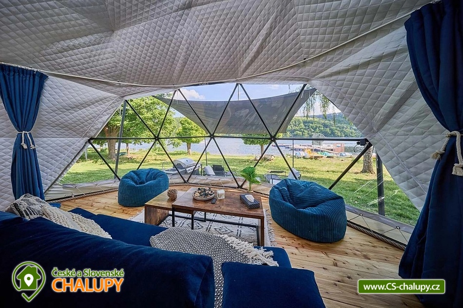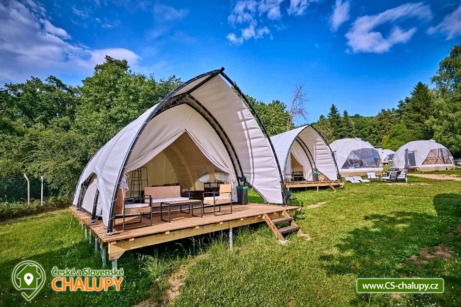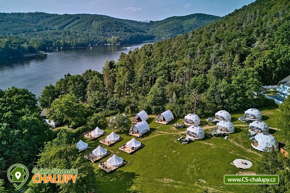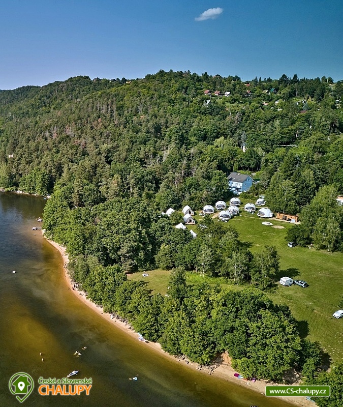 Experience accommodation in tents with air conditioning by the dam - Glamping camp by the Slapy nad Vltavou dam. Do you want to surprise your significant other with a romantic stay or are you looking for an interesting place for teambuilding? Visit the Glamping camp, which is located in a recreational area on the shore of the Slapy Reservoir. A unique experience awaits you, combining the comfort of unconventional accommodation with the magic of camping by the water. In the evening, you fall asleep under the stars, which you can observe through the skylight directly from your bed. The Glamping camp area has a capacity of 61 beds in 17 separate accommodation units and is accessible from April to December. You can choose according to your preferences: Two 4-bed Glamping tents in a nautical style, Two 4-bed Glamping tents in a boho style, Two 4-bed Glamping tents in a children's style, Four 4-bed Sailing tents and Seven 3-bed Bell tents. In the Glamping tents, you can enjoy a peaceful sleep on a sofa serving as a bed for two people and a raised double bed (mattresses), from which you can watch the shooting stars through the skylight. The interior includes a smart kitchenette with a microwave, refrigerator and kettle. Air conditioning is a pleasant bonus. You can freshen up in the bathroom equipped with a shower, toilet and sink. In the Sailing tents you will find two double beds and in the Bell tents there are three beds made of wooden pallets. The equipment includes a refrigerator and kettle. You can prepare refreshments in the shared kitchen, where there is a microwave and a self-service bar. There are plenty of shared sanitary facilities with showers, toilets and sinks in the area. We are happy to prepare a cot and a high chair for children. If necessary, we will provide two more extra beds. WiFi is a matter of course. Each tent has a seating area and a grill, where you can prepare your favorite sausages or bacon in the open air. During the summer season, enjoy breakfast directly in the restaurant, which is part of the complex and offers delicious meals and refreshing drinks. The youngest tourists will be delighted by the children's playground with swings, a sandbox, a trampoline and toys. Sports lovers will appreciate the possibilities of badminton, table tennis and board games. Stays with dogs are allowed with us. There are enough parking spaces for parking vehicles directly by the tents free of charge. When visiting, be sure to not miss the beautiful Máj viewpoint and the Pepř, Veselý vrch and Drtinova rozhledna lookout towers. Athletes can visit the Slapy rope park. We look forward to seeing you with us.